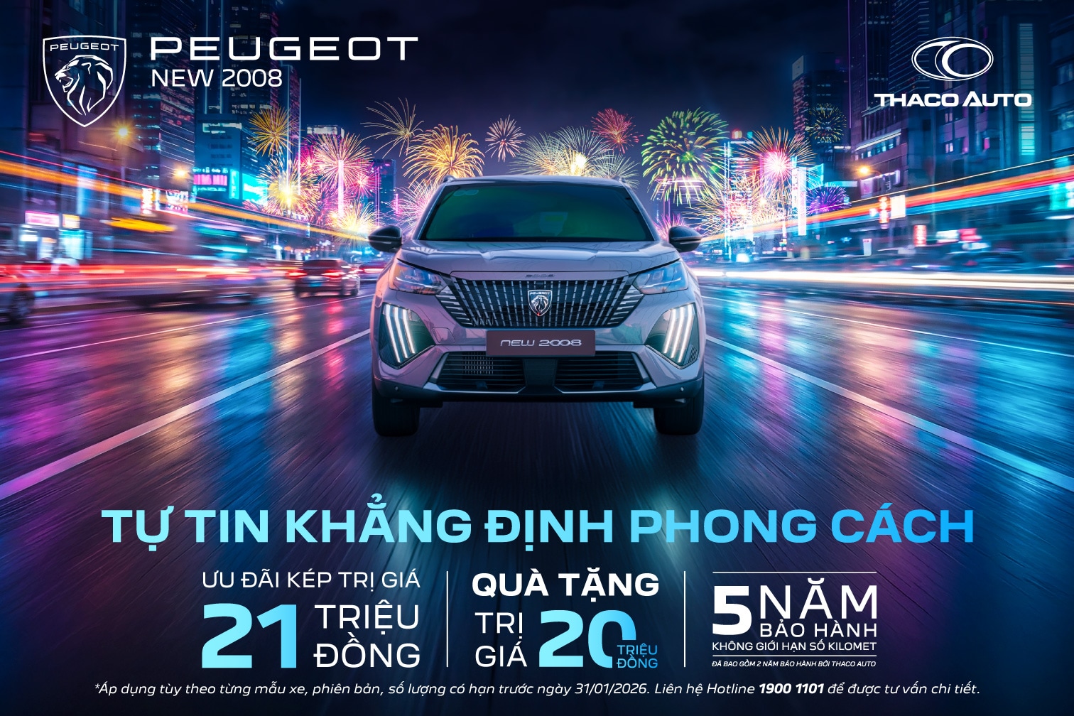 New Peugeot 2008 mang phong thái trẻ trung và hiện đại với cụm đèn LED mô phòng “Móng vuốt Sư Tử” đặc trưng và lưới tản nhiệt cùng màu thân xe, tạo nên vẻ ngoài nổi bật giữa những ngày phố xá cuối năm tấp nập. Trải nghiệm lái được nâng tầm với khoang lái Peugeot i-Cockpit®, đồng hồ kỹ thuật số sắc nét, vô-lăng D-Cut thể thao và các tiện nghi cao cấp: ghế da Alcantara sang trọng, massage ghế người lái, cửa sổ trời toàn cảnh, và sạc không dây công suất 15W. Hệ thống camera trước/sau giả lập 360 độ giúp bạn tự tin làm chủ mọi góc phố. Xe đang có ưu đãi lên đến 21 triệu đồng, mức giá hấp dẫn chỉ từ 838 triệu đồng.