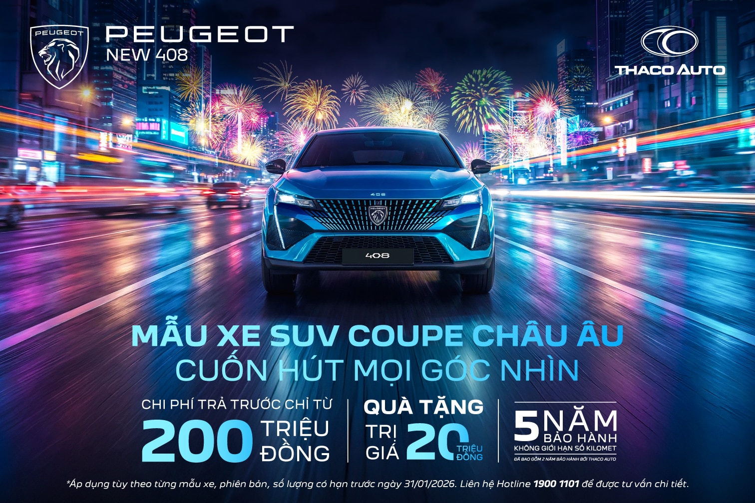 New Peugeot 408 là lựa chọn dành cho những khách hàng yêu thích sự khác biệt. Không gian bên trong New Peugeot 408 được thiết kế theo ngôn ngữ Peugeot New i-Cockpit, tối ưu hóa trải nghiệm Nghe – Nhìn – Chạm, mang đến cảm giác độc đáo và khác biệt. Với động cơ 1.6 Turbo Puretech thế hệ mới mạnh mẽ vượt trội kết hợp cùng hộp số tự động 8 cấp cho khả năng tăng tốc từ 0 đến 100 km/h trong vòng 8.8 giây giúp New Peugeot 408 trở thành bạn đồng hành lý tưởng cho các chuyến du lịch hoặc những cuộc dạo phố ngày lễ. Trong năm 2026, New Peugeot 408 mang đến lợi thế lớn với giá bán chỉ từ 999 triệu đồng và chi phí trả trước chỉ từ 200 triệu đồng. Đặc biệt, phiên bản Legend Edition – giới hạn chỉ 215 chiếc – gây ấn tượng với màu sơn Xám Selenium mới, ghế da nâu sang trọng, logo kỷ niệm 215 năm trên tựa đầu ghế và bộ quà sưu tầm độc quyền. Đây là cơ hội lớn nhất trong năm để sở hữu ngay phiên bản kỷ niệm 215 năm, chỉ có duy nhất dịp cuối năm.