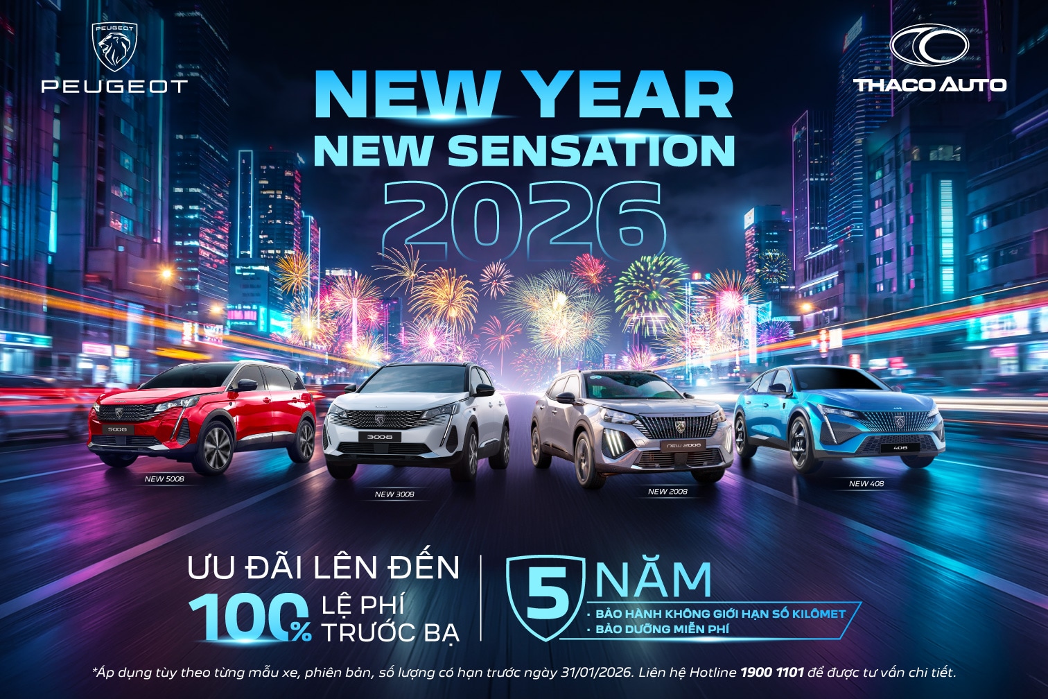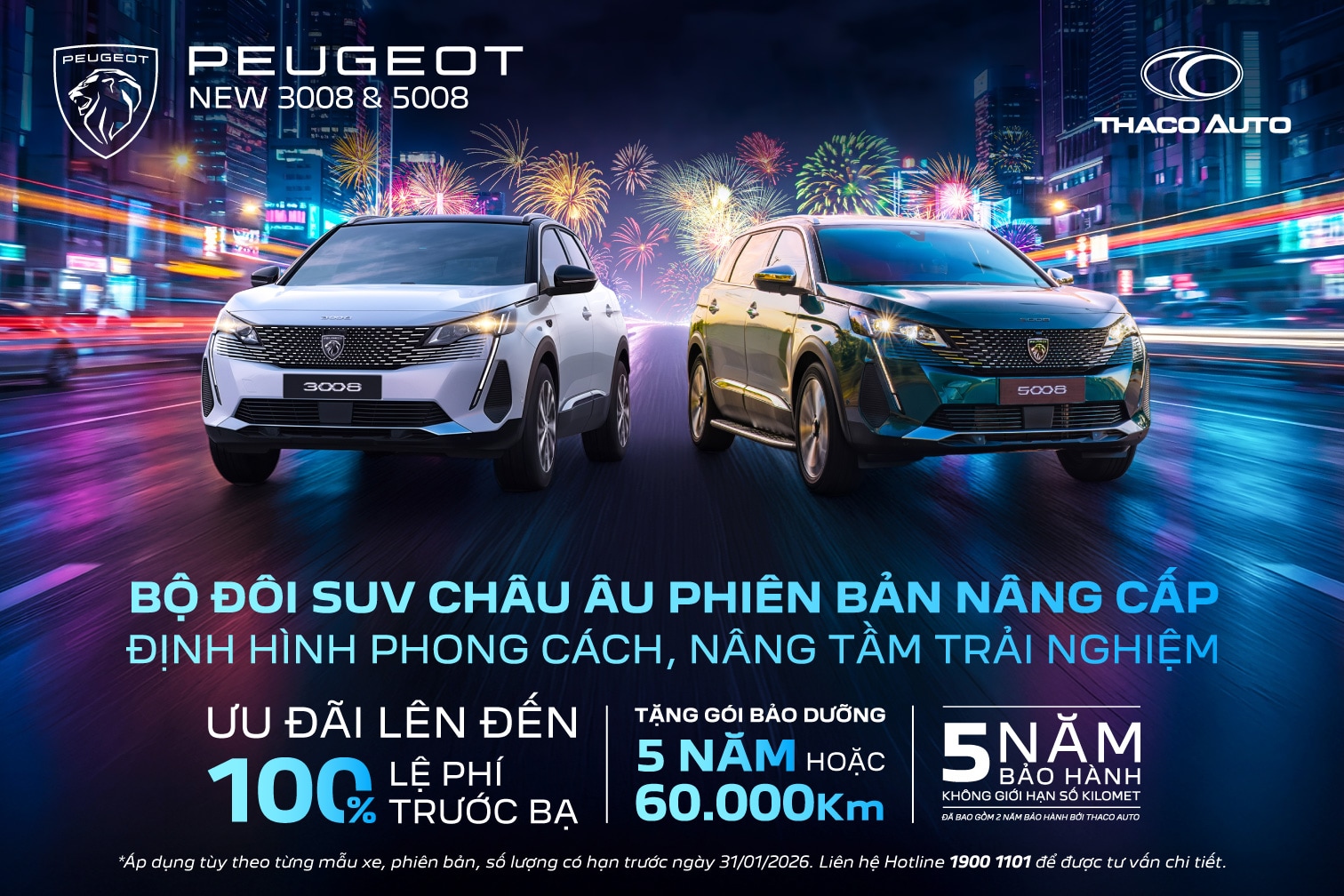 Khởi đầu năm mới cùng New Peugeot 3008 & 5008 phiên bản nâng cấp, bộ đôi SUV châu Âu dẫn đầu phân khúc C và D, giá chỉ từ 849 triệu đồng kèm 100% lệ phí trước bạ, quà tặng 20 triệu đồng và bảo dưỡng 5 năm hoặc 60.000 km trị giá 42 triệu đồng.